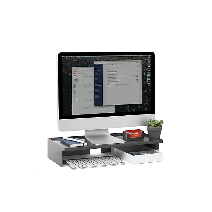 Store up to 60 pounds of items on this versatile riser stand. The open design creates an area below for additional storage. A cutout at the back keeps cords out of your way, reducing entanglements and offering a neater look. This Poppin dark gray monitor riser stand has a smooth lacquer finish that works with a wide range of decor styles and is easy to clean.