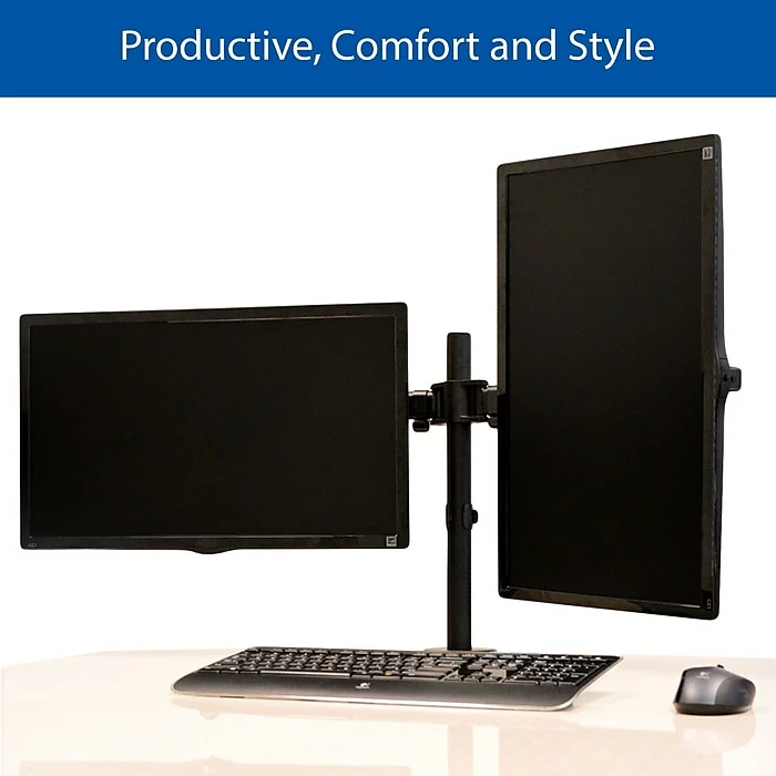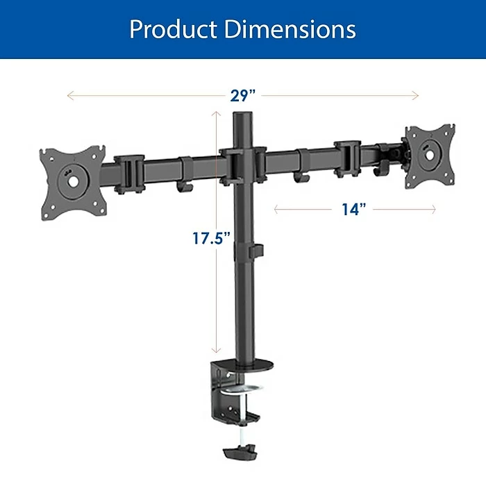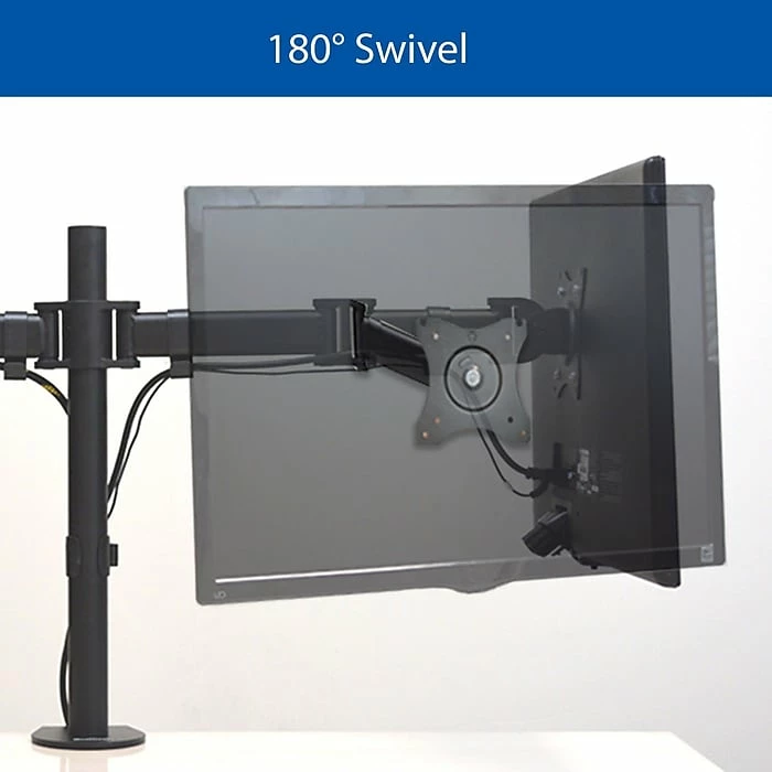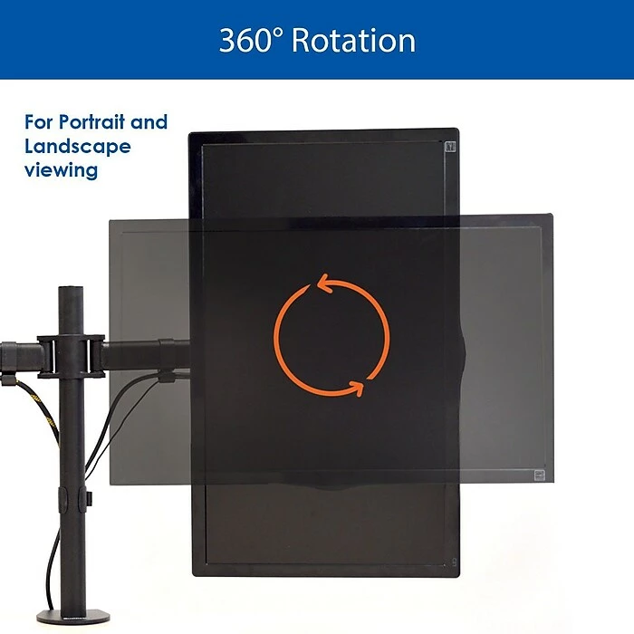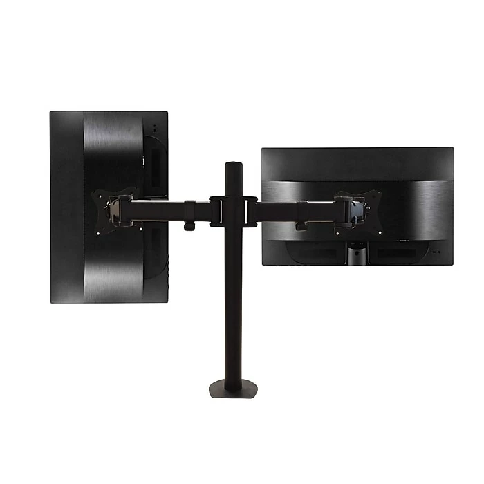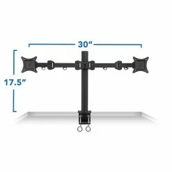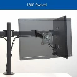 The QualGear QG-DM-02-022 is a durable and customizable dual arm monitor mount capable of being mounted via clamp or grommet suitable for monitors from 13″ to 27″. The featured ball joint design allows up to 40 degrees of tilt along with 360 degrees rotation. Dynamically adjustable height allows for on-the-fly vertical adjustment. Included integrated cable clips allow for sleek and organized cable routing. The triple joint design allows for unmatched flexibility and full 180 degrees swivel motion while being capable of supporting up to 17.6 lbs. in each arm.