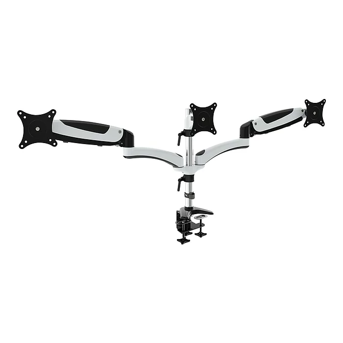 SIIG’s Triple Monitor Desk Mount – 13″ to 24″ is a full-motion desktop mount designed to accommodate three flat panel monitors for an instant ergonomic desktop setting. Premium quality construction ensures sturdiness and durability to support three monitors from 13″ to 24″ with weight up to 17.6 lbs each. It features dual gas spring assisted full-motion arms to provide smooth and effortless angle adjustment for the most comfortable viewing position. Heavy-duty C-clamp and grommet mount bases are both included for convenient mounting options to enable quick and easy installation to most desks and tables. Unique cable management system is integrated to keep cables neatly organized and out of the way. This space-saving full motion triple monitor desk mount is an ideal desktop organizing tool for use in business or home office to provide ergonomic comfort, reduce desktop clutter and increase productivity.