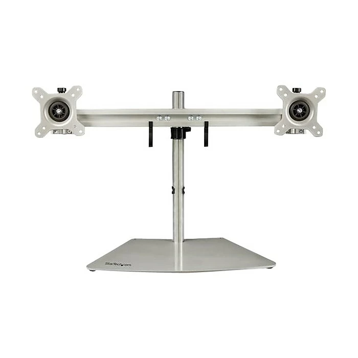 - DUAL 24 INCH MONITOR MOUNT: VESA 75×75/100x100mm compatible heavy duty freestanding dual monitor desktop stand supports two displays up to 24″ (18lb/8kg) per screen; Features a stylish silver finish
