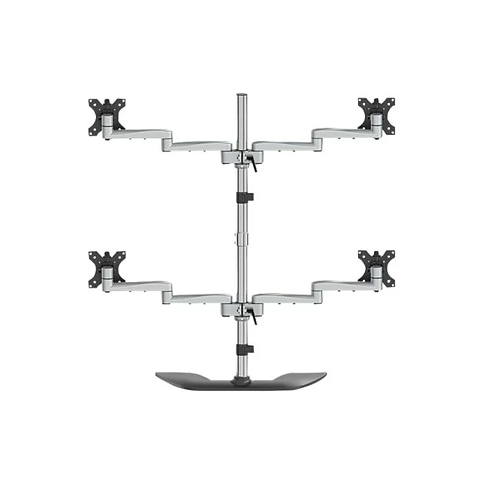 Four Monitor Mount Height Adjustable For Up to 32″ Monitors. Boost productivity and customize your workspace with this quad-monitor stand, suspending four monitors above your desk. Enjoy optimum viewing with four articulating monitor arms, providing a wide range of motion. The free-standing base gives you flexibility in placing your setup within your workspace. Designed for Productivity Constructed of aluminum and steel, the heavy-duty four-monitor stand lets you set up your workspace for optimum productivity. The monitor stand supports four VESA mount (75×75, 100×100) monitors up to 32″ each, with a maximum weight capacity of up to 17.6 lb./8 kg per display. Create a More Ergonomic Workspace Create a multi-monitor workstation that works best for you. Take advantage of four-screen efficiency for financial analysis, web coding, video editing or many other applications. Customize your setup by adjusting your display height, position and viewing angles for an ergonomic workspace. The swiveling arms provide maximum viewing flexibility. Height-Adjustable Monitor Mount Place your monitors at the ideal height. Simply adjust the display height along the 34″ (864 mm) pole. Align your monitors with the micro-adjustment feature. Enjoy Optimum Viewing The four-screen monitor stand lets you extend the articulating arms up to 16.6″ (42.2 cm) to position your monitors in the ideal position. Tilt your monitors +90/-40 degrees and swivel 360 degrees. Rotate your displays 360 degrees for portrait or landscape viewing. Keep Cables Out of View Neatly route your cables with the cable-management channels. ARMQUADSS is backed by a StarTech.com 5-year warranty and free lifetime technical support.