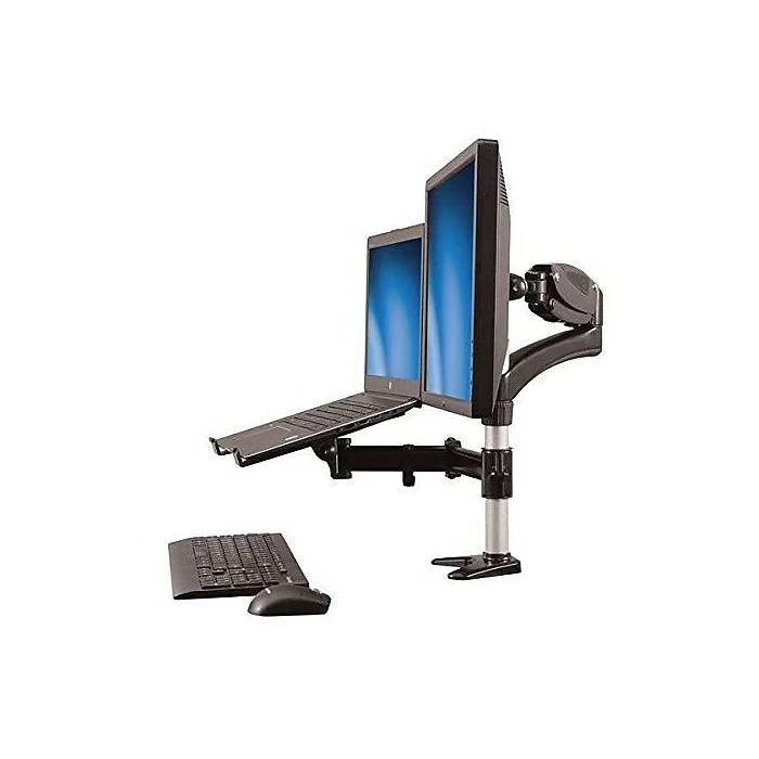 The StarTech.com® ARMUNONB 15″ – 27″ monitor mount has an integrated stand that elevates laptop off your desk by aligning it with other display. It replicates a dual-monitor setup by integrating the laptop as a second display. This monitor mount comes with articulating arm and laptop riser.