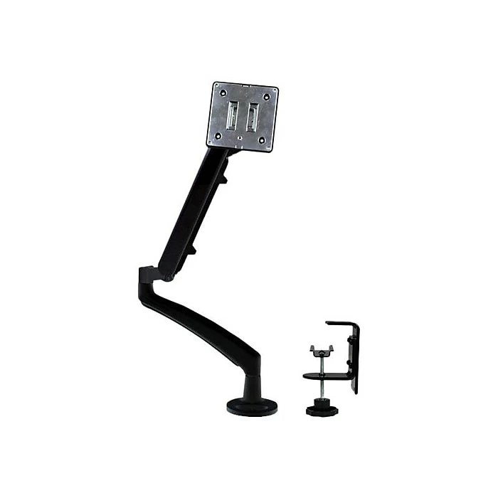 The StarTech ARMSLIM black slim articulating monitor arm allows you to mount a flat-panel display on your desk or table, with dynamic adjustments. It supports simple landscape-to-portrait display rotation for viewing longer pages or blocks of code without having to scroll down your screen. Monitor supports flat panel display up to a maximum weight capacity of 15lbs. The versatile monitor arm lets you extend, tilt, pan, swivel and pivot your display with a full range of motion across multiple axes.