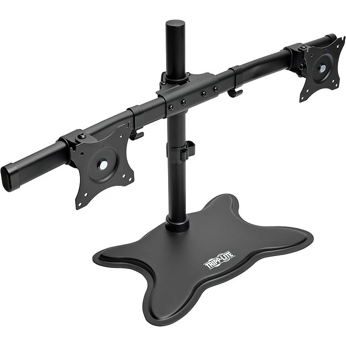 The VESA-compliant DDR1327SDD Dual Flat-Screen Monitor Desktop Mount Stand mounts two flat-screen monitors on a sturdy base, allowing you to free up valuable workspace on your desk, table or workstation. Recommended for home or office, the DDR1327SDD fits most flat-panel displays from 13 to 27 inches. Position your monitors with one-touch ease to optimize viewing angle and height to fit your environment and comfort level. A 180 swivel and -45 to +45 tilt capability minimizes glare and provides comfortable viewing from multiple angles. A 360 rotation lets you view your monitors in portrait or landscape orientation. Each VESA mount supports up to 26 pounds. The durable steel frame with scratch-resistant powder-coated finish tolerates frequent handling and blends with any decor. Mounting hardware is included. Conforms to VESA-compliant displays with either of the following mounting hole patterns: 75 x 75 mm and 100 x 100 mm. Features: Mounts 2 Flat-Screen Monitors on a Sturdy Base : Fits most flat-panel TVs, monitors and other displays from 13 to 27 in. Frees up valuable workspace on your desk, table or workstation. Mounting arms adjust independently for viewing angle. Ideal for home or office use. Convenient One-Touch Adjustment : 180 swivel and -45 to +45 tilt capability provide comfortable viewing. Full 360 rotation for viewing in portrait or landscape orientation. Durable Steel Construction : Each mount supports up to 26 lb. Scratch-resistant powder-coated finish blends with any decor. Mounting hardware included. VESA Compliance : Supports the following VESA mounting hole patterns: 75 x 75 mm and 100 x 100 mm. Package Includes: Pole. Base. (2) Mounting arms. Locking head assembly. Pole cable guide. Base collar. (2) VESA plate assemblies. (2) Arm cable guides. (2) End caps. (8) Washers. (18) Screws. Hex key, 3 mm. Hex key, 4 mm. Hex key, 6 mm. Owner’s manual.