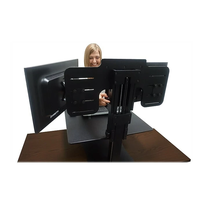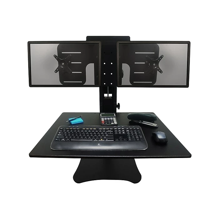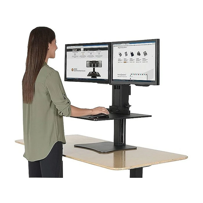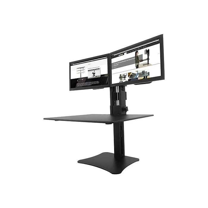 Work in your preferred posture and multitask more easily with this desk converter, which can hold up to two 24-inch monitors and adjusts from sitting to standing height with the twist of a knob. This Victor Technology High Rise desk converter includes a 23 x 28-inch work surface to keep a keyboard, mouse, notepad or phone easily accessible in either position.