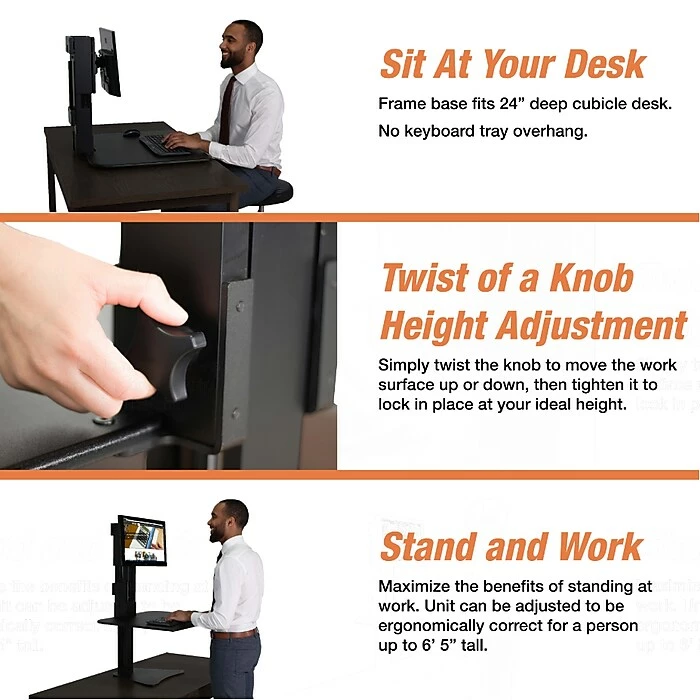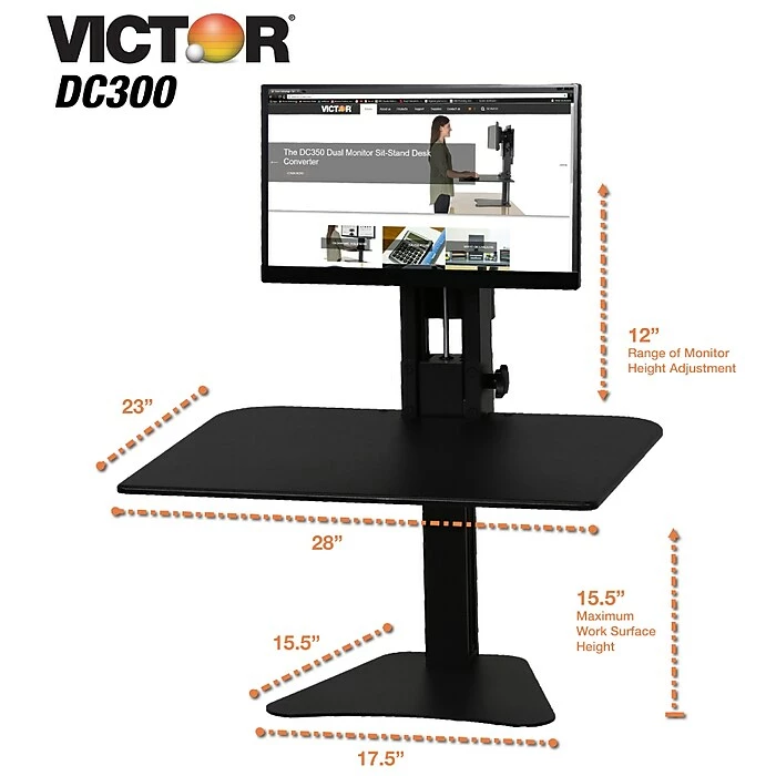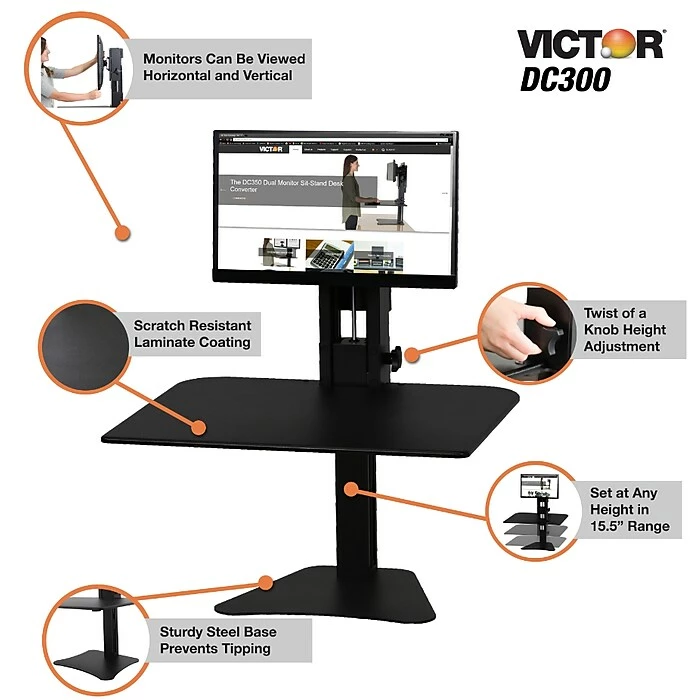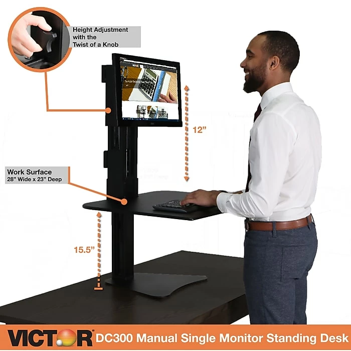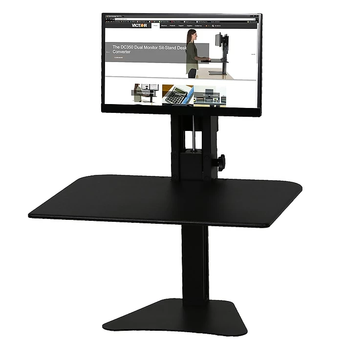 Make workspaces flexible with this standing desk converter. This converter supports a single monitor at eye level and is a manual unit that is easily adjustable, depending on the user’s height. This durable converter is made to last, as the base is constructed with steel. This Victor high-rise desk converter can be lowered back down to desk level for use as a standard, seated desk.