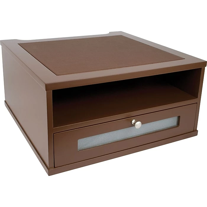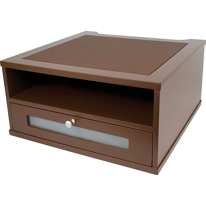 - Durable MDF in an attractive brown finish with a faux leather top to keep your monitor in place without scratching